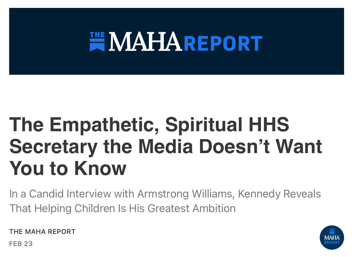 Published on Feb 11, this memo could be obsolete given the civil war that erupted in MAHA last week thanks to GlyphoGate. Last Wednesday, Trump signed an executive order to ramp up production of glyphosate, arguing that shortages of phosphorous and glyphosate were national security risks. Given that RoundUp is ground zero for MAHA influencers, you might expect Kennedy to denounce the president’s action. Not only didn’t he do that, the HHS Secretary defended his boss, saying: