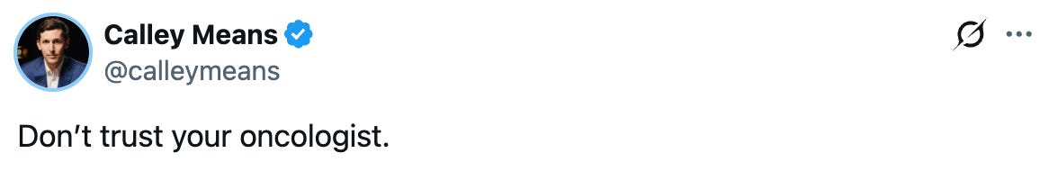 Ironically, even though Cassidy was the deciding vote that installed Kennedy, MAHA PAC, Kennedy’s fundraising arm, is donating $1 million to defeat Cassidy in a Republican primary this year. It’ll be interesting to see how he votes on Means’s nomination, but I’m certainly not holding my breath that he’ll do the right thing.